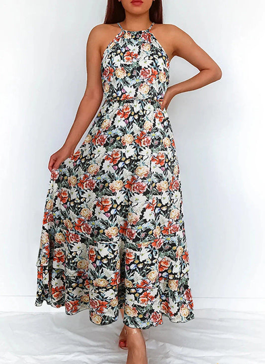 Elegante vestido de falda de una pieza con escote plisado cortado al bies y estampado de dibujos